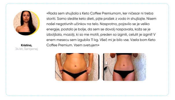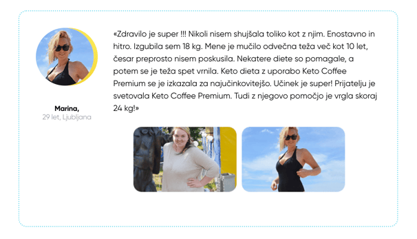 "Izdelek je naravnost vrhunski! Meni je pomagal že hitro po začetku uporabe. Izgubila sem 5 cm okoli pasu v 5 tednih. Uporabljala ga bom še naprej... Hvala vam 💛"